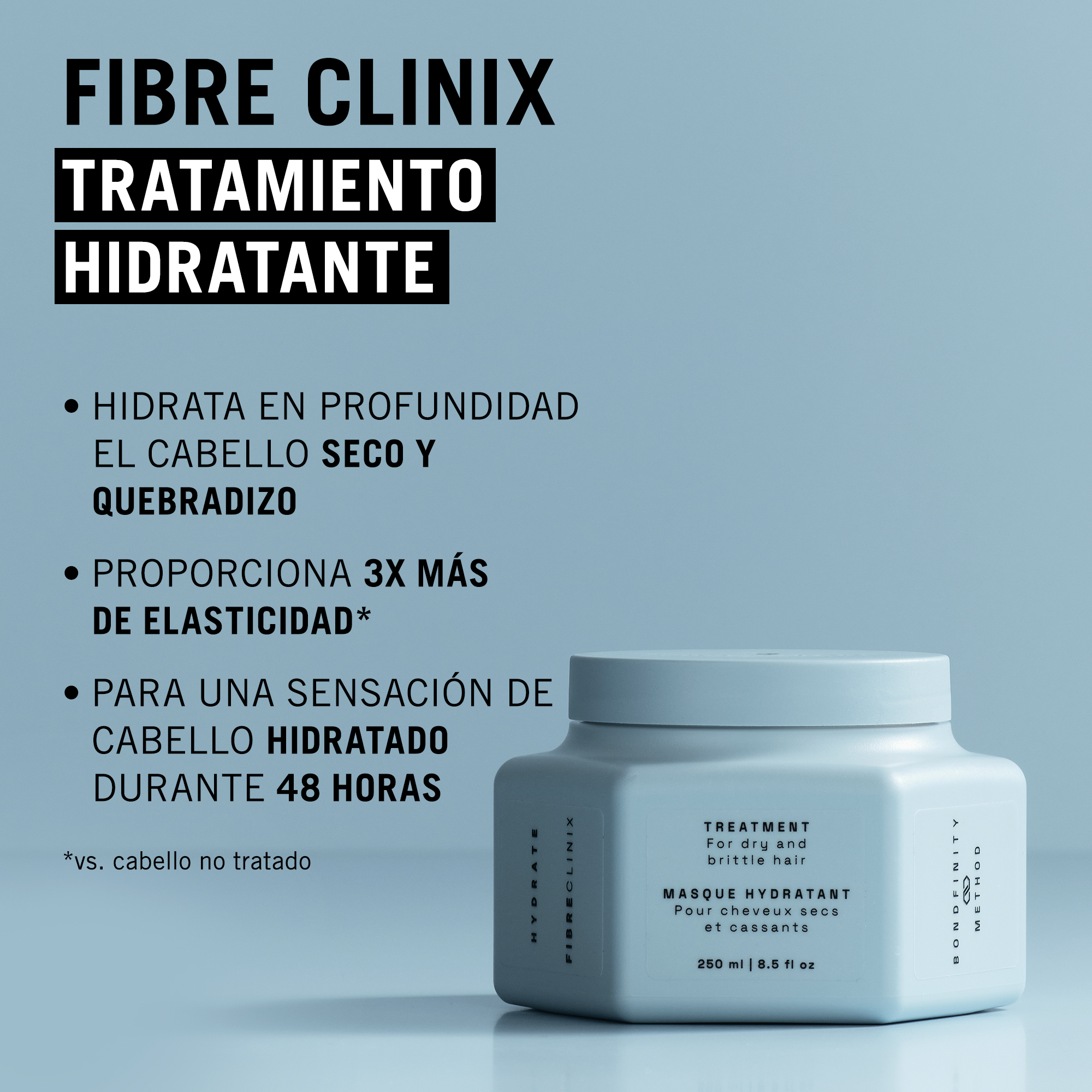 El Tratamiento Hidratante de Fibre Clinix, formulado con la Tecnología BONDXTEND para fortificar el cabello creando puentes en su interior, es un tratamiento que hidrata de forma intensiva y fortifica en profundidad el cabello seco y quebradizo. Su fórmula, con electrolitos integrados, recarga el cabello seco con un cuidado intensivo para una manejabilidad y elasticidad mejoradas creando una suavidad repleta de hidratación y un brillo efecto cristal.